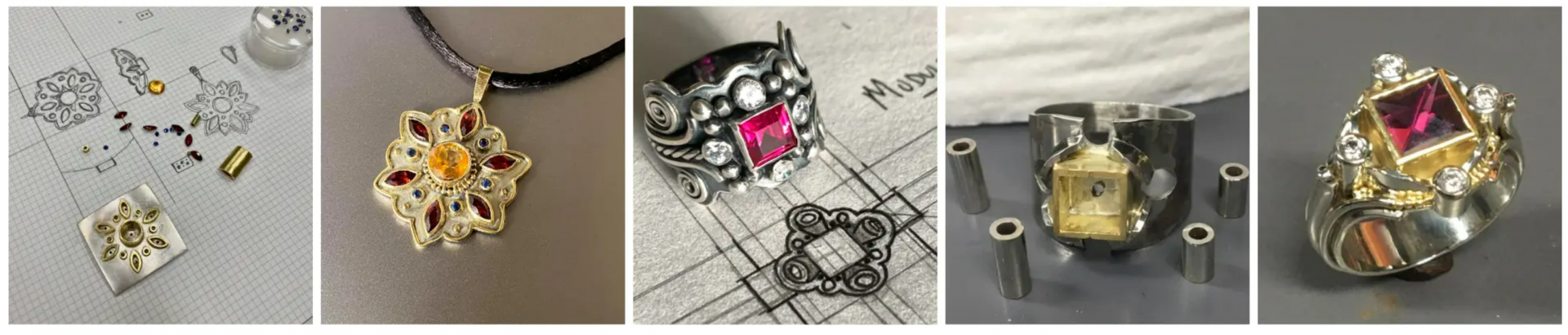 The ‘Unveil Your Mastery’ program is the first step in receiving Kent’s direct mentorship. In this program you learn many specific fabrication and bezel setting skills. In the Mastermind group, Kent takes the learning to the next level by helping you integrate these skills into your own designs. He introduces more advanced projects building on what you’ve learned in Unveil Your Mastery. For example we are now working on screw clasps in this group, taking it step at a time. All past projects are available to all who join this group, like creating opening bales that snap closed, pendant challenges, more advanced ring projects and more! Kent has also helped students work through design and technical challenges on commissions for their clients!